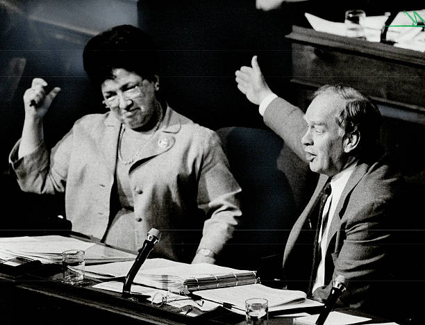 CANADA – JUNE 17: Party programs: Premier Frank Miller and Deputy Premier Bette Stephenson don’t let looming defeat in the Ontario Legislature dampen their enthusiasm for new government programs; announced by the Conservatives yesterday. The new measures range from tornado relief to extra hospital funding. (Photo by Mike Slaughter/Toronto Star via Getty Images)